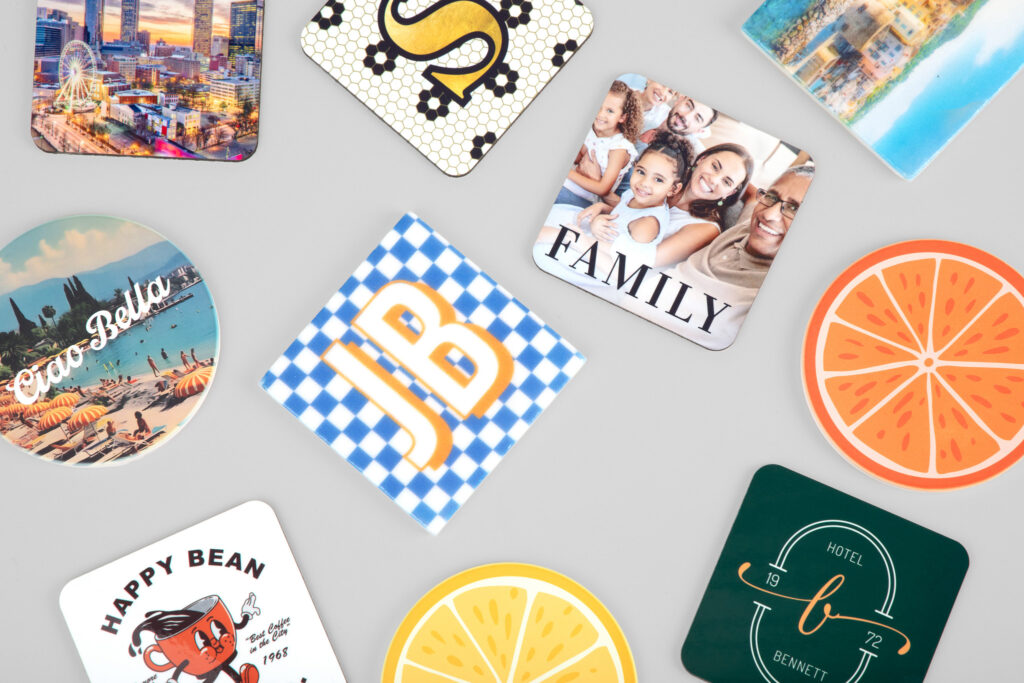 Coasters can function as decor and a party favor. They are great for: